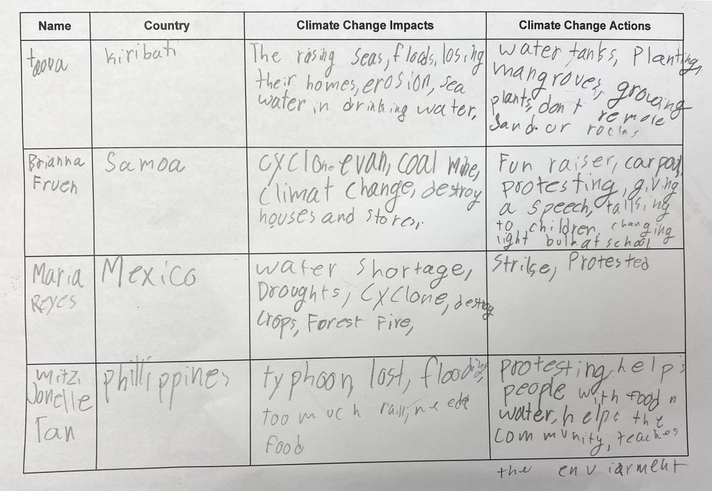 As the fifth graders viewed the videos, we asked them to complete a graphic organizer to capture details about the climate warriors. Along with each of the activist’s names and countries, the class noted the climate impacts, experiences, and actions taken. It is essential to balance the reality of the impacts with positive examples of advocacy in order to assure students that even though climate change has harmful consequences, people can and are making a difference.