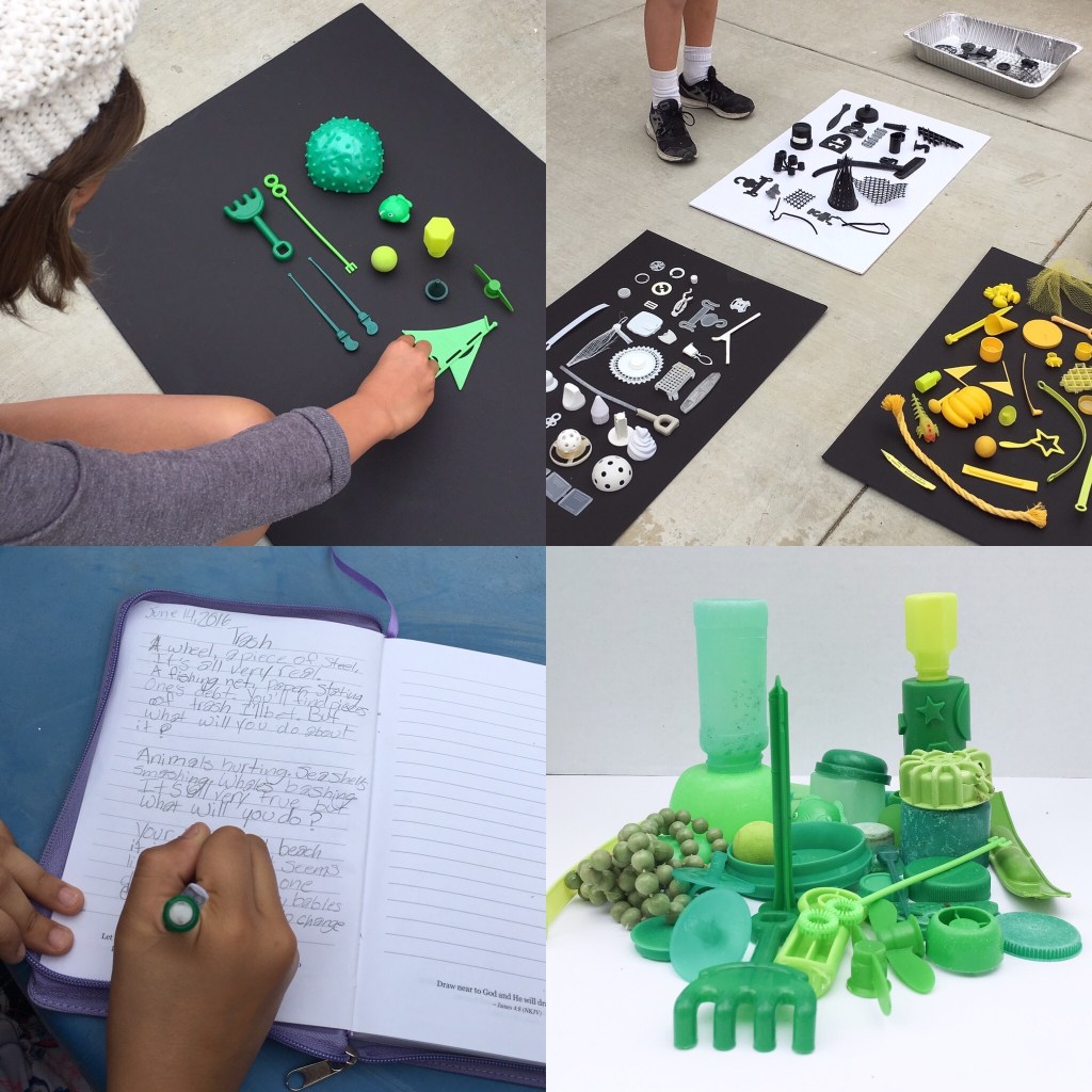The first time I shared my passion for cleaning the beach with students during a Young Writers’ Camp program was in the summer of 2015. That initial experience took place during short rotation stations with limited time to talk, create, and write. Despite the constraints, campers had fun making abstract designs with the washed and sorted plastic marine debris I had collected from the local coastline.