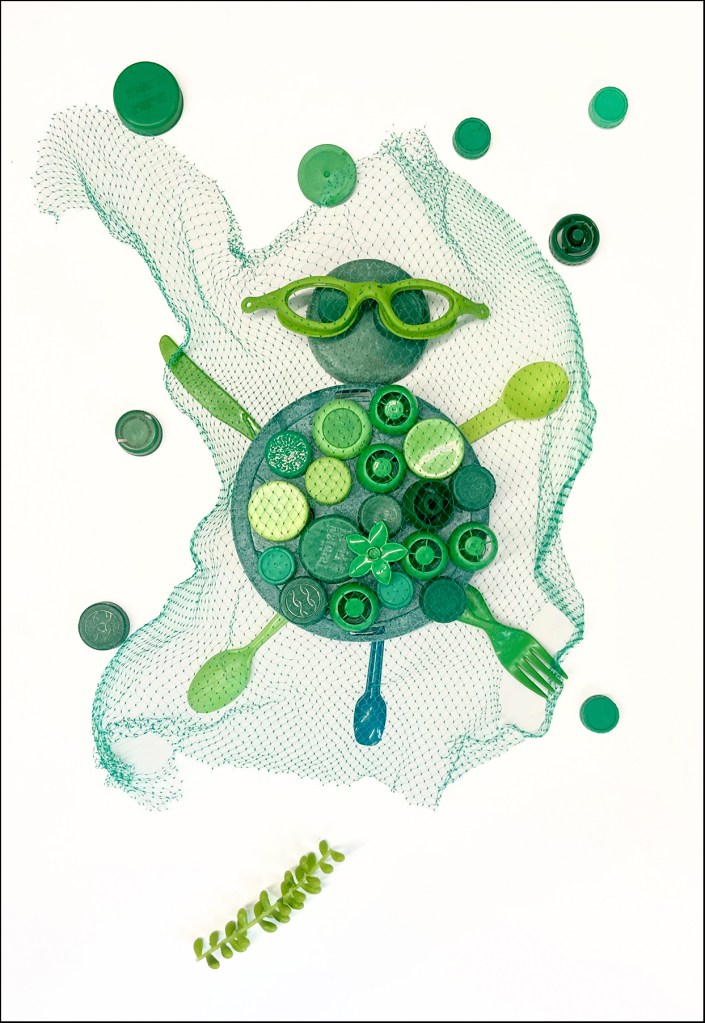 The turtle is stuck, not only in a green net thrown out by someone, but in a sea full of trash. Goggles, spoons, forks, knives, and more bottle caps than you could ever imagine fill the water….We need to make sure that turtles in the ocean don’t end up like this one—scared and stuck in a sea full of trash.
