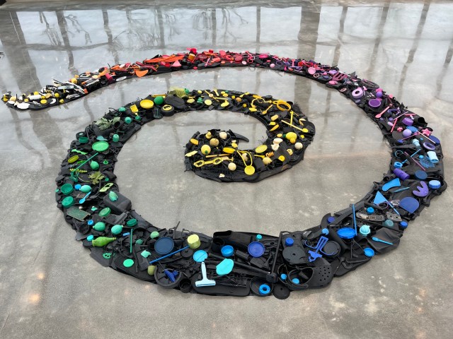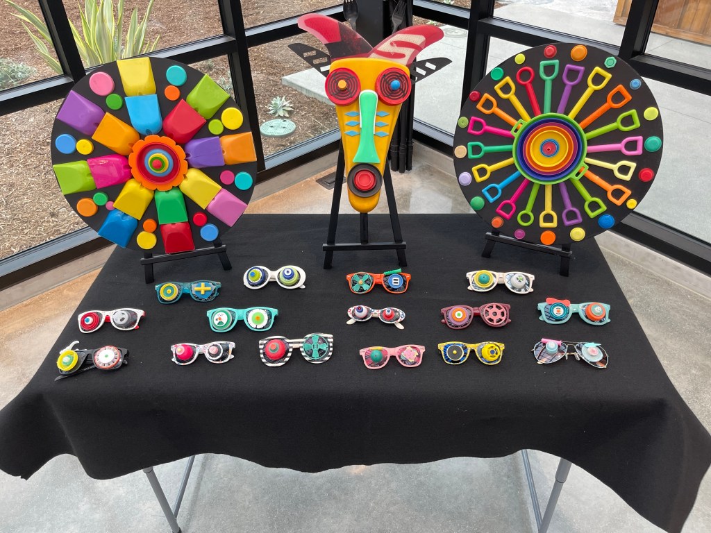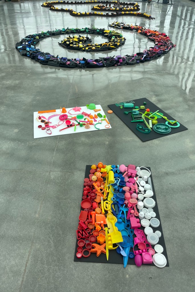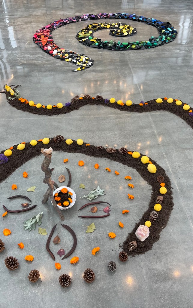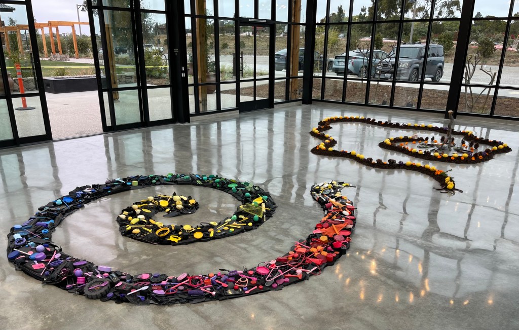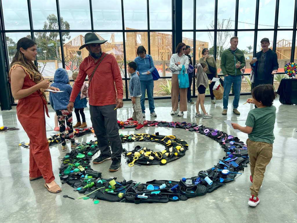 This colorful spiral, made entirely from plastic collected on North County San Diego beaches, symbolized the swirling ocean currents that carry debris into the North Pacific Garbage Patch. It offered a striking contrast to Lia Strell’s beautiful installation made from foraged natural materials — compost, lemons, pine cones, marigolds, and driftwood.