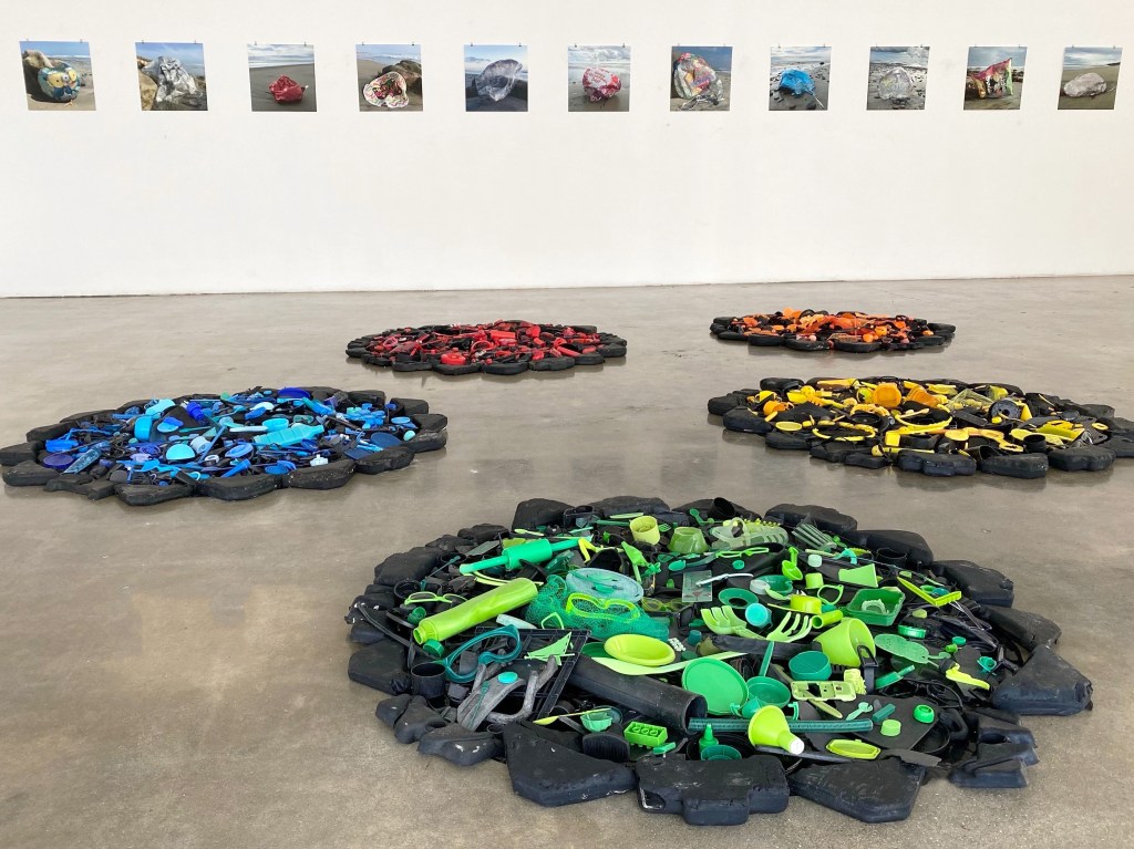 Each time I clean the beach, I notice the contrast between the man-made refuse and the beauty of the shore, the crashing waves, and the ever-changing sky out toward the horizon. I enjoy the challenge of making something out-of-place look visually pleasing as I seek to tell the story of our polluted planet.
