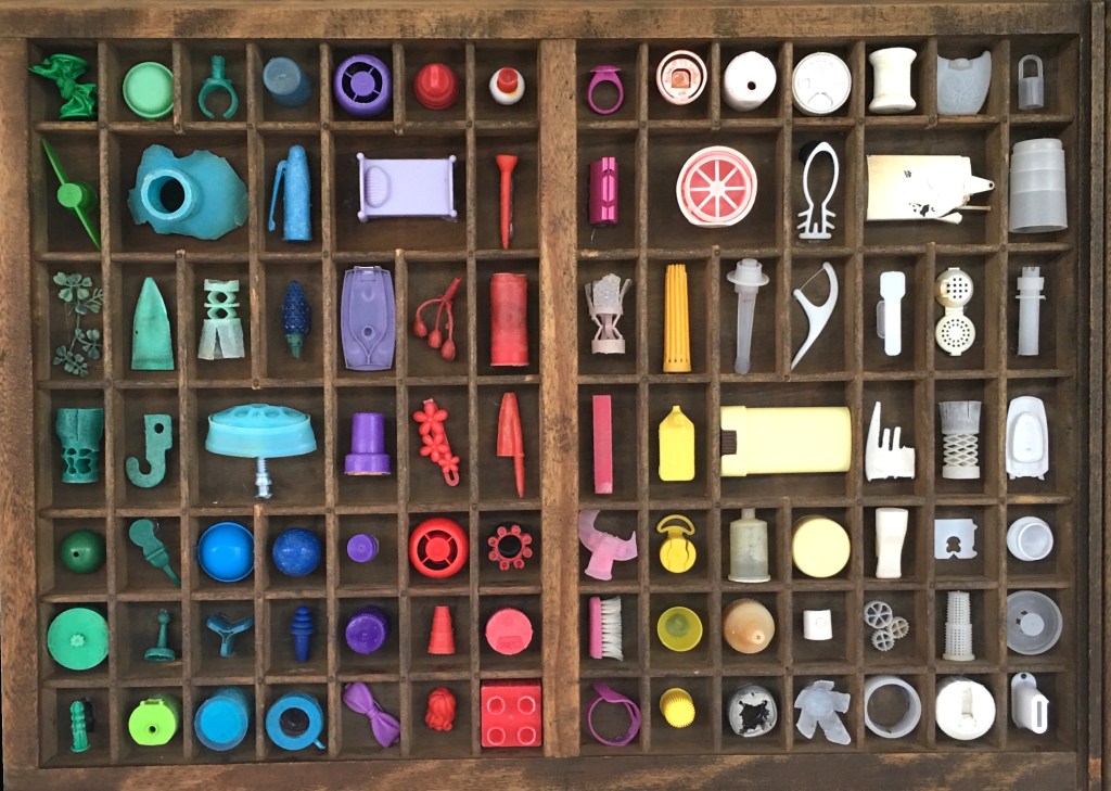 Letterpress trays were once used to store moveable letters for typesetting. This Litterpress displays pieces of marine debris that were found on beaches in North County San Diego. Some of the items are recognizable as the objects they once were, and others are unidentifiable. Look closely at each block. Can you find the contact lens case, cigar tip, snack pack cheese spreader, Lego wig, or tooth flosser? What else can you identify?